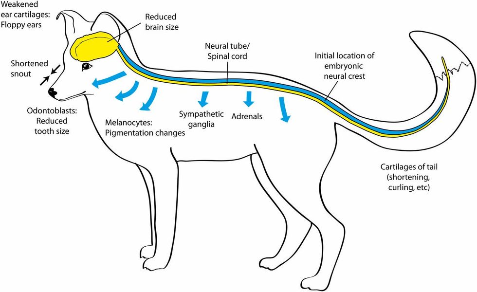 The neural crest is a congregation of cells that forms in a developing embryo. This tiny mass eventually breaks up and becomes different tissues in the body, including the adrenal glands—responsible for the stress response (and in a way, temperament), cartilage in the ears, melanocyte cells which create the skin’s pigment, and dentin which forms the teeth. They also earmarked dozens of genes associated with domestication, each one linking back to the neural crest.