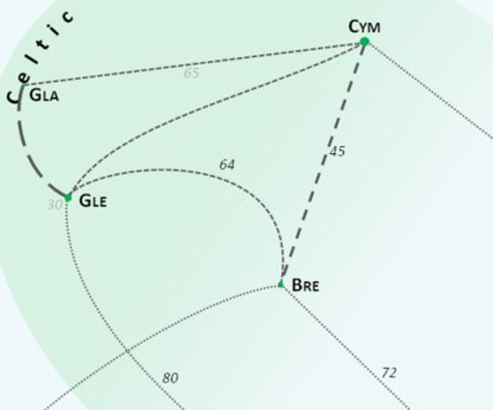 The Celtic family portrait is a grim picture: small language dots, separated by a lot of mutual incomprehension: the distance is quite far between Breton and Welsh, a bit closer between Irish and Scottish Gaelic, and further still between the first and second pair.