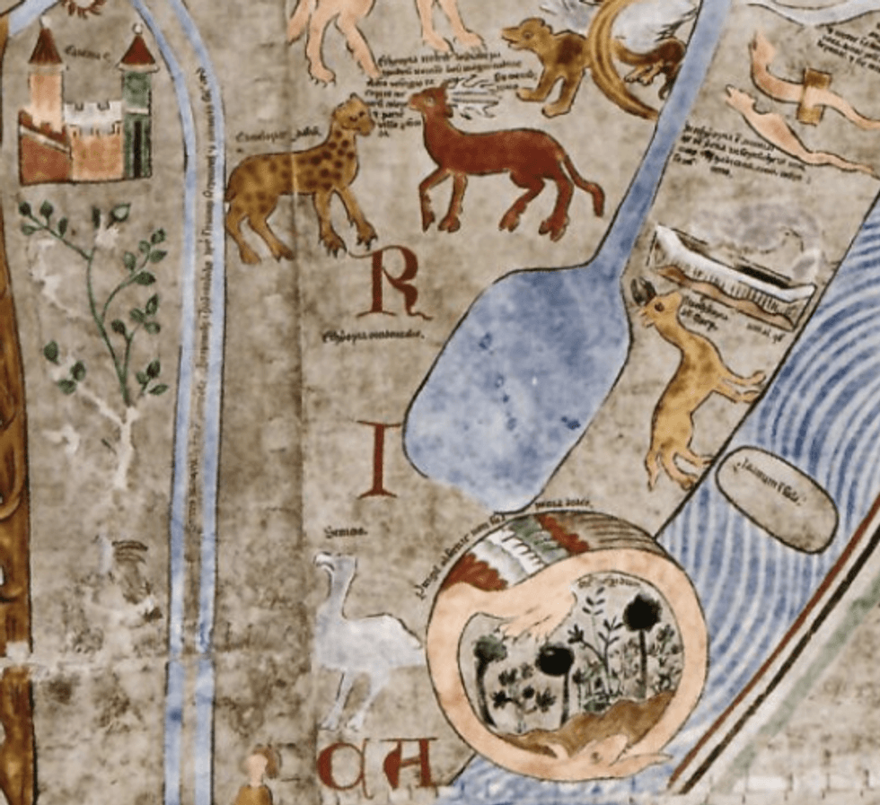 Well, perhaps not all of it. Africa is filled with strange peoples and animals, including crocodile-riding dwarves, mouthless men, giants, and centaurs. In Asia, we find the yale, a strange deer with one horn pointing forward, and another pointing backward. There is the Garden of Eden: near the Ganges, in India (see also #583).