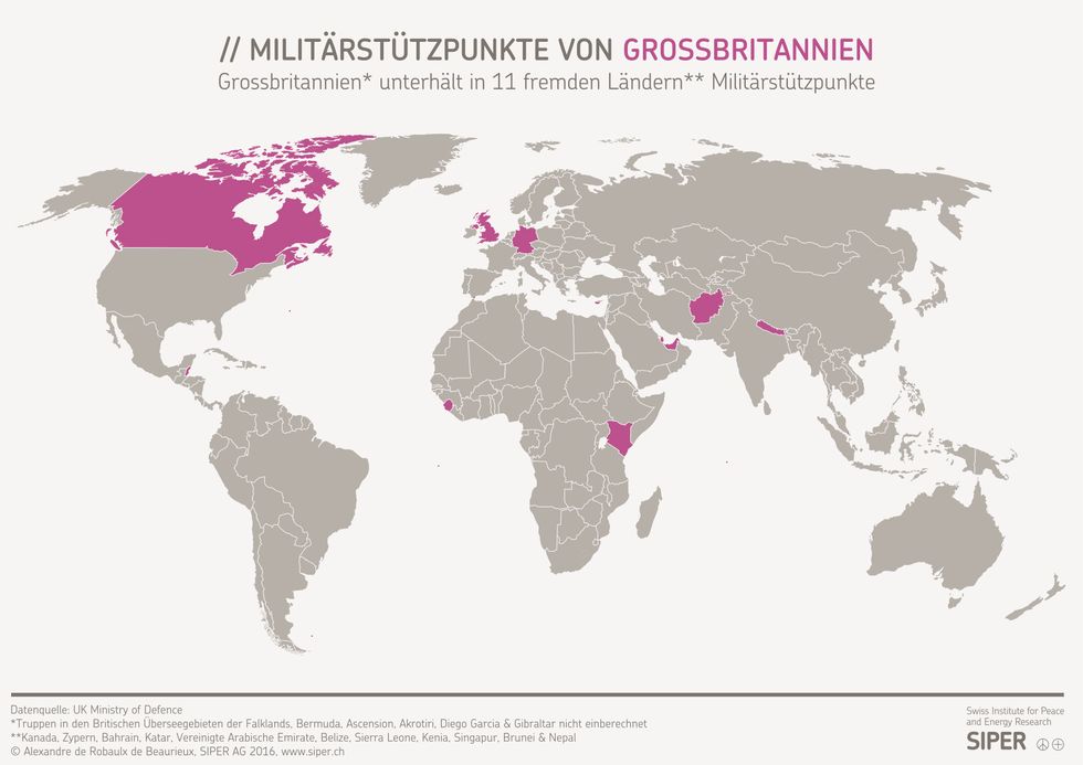 These maps, produced at the end of last year by the Swiss Institute for Peace and Energy Research (SIPER), show the geographic distribution of foreign military bases for five countries with some of the largest defence budgets (1) in the world.